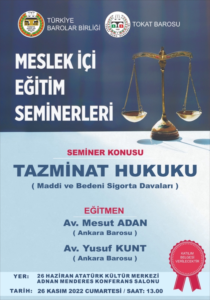 TAZMİNAT HUKUKU(MADDİ VE BEDENİ SİGORTA DAVALARI) KONULU MESLEK İÇİ EĞİTİM SEMİNERİ