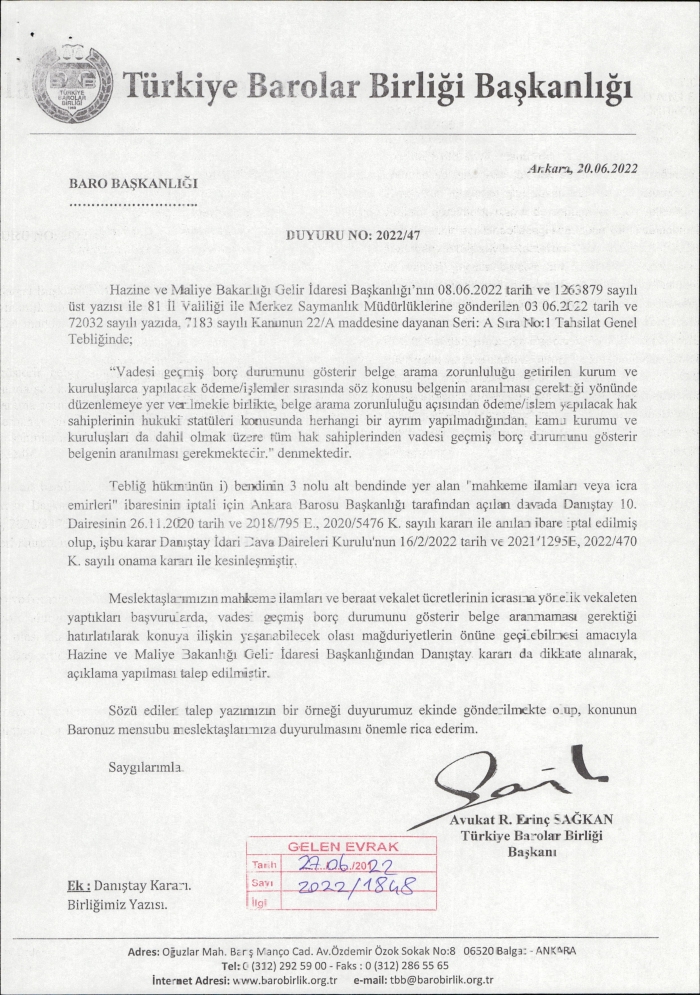 Türkiye Barolar Birliği Başkanlığının 20.06.2022 Tarih 2022/47 Sayılı Duyurusu