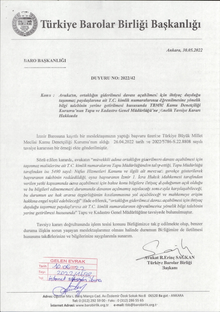 Türkiye Barolar Birliğinin 30.05.2022 Tarih 2022/42 Sayılı Duyurusu