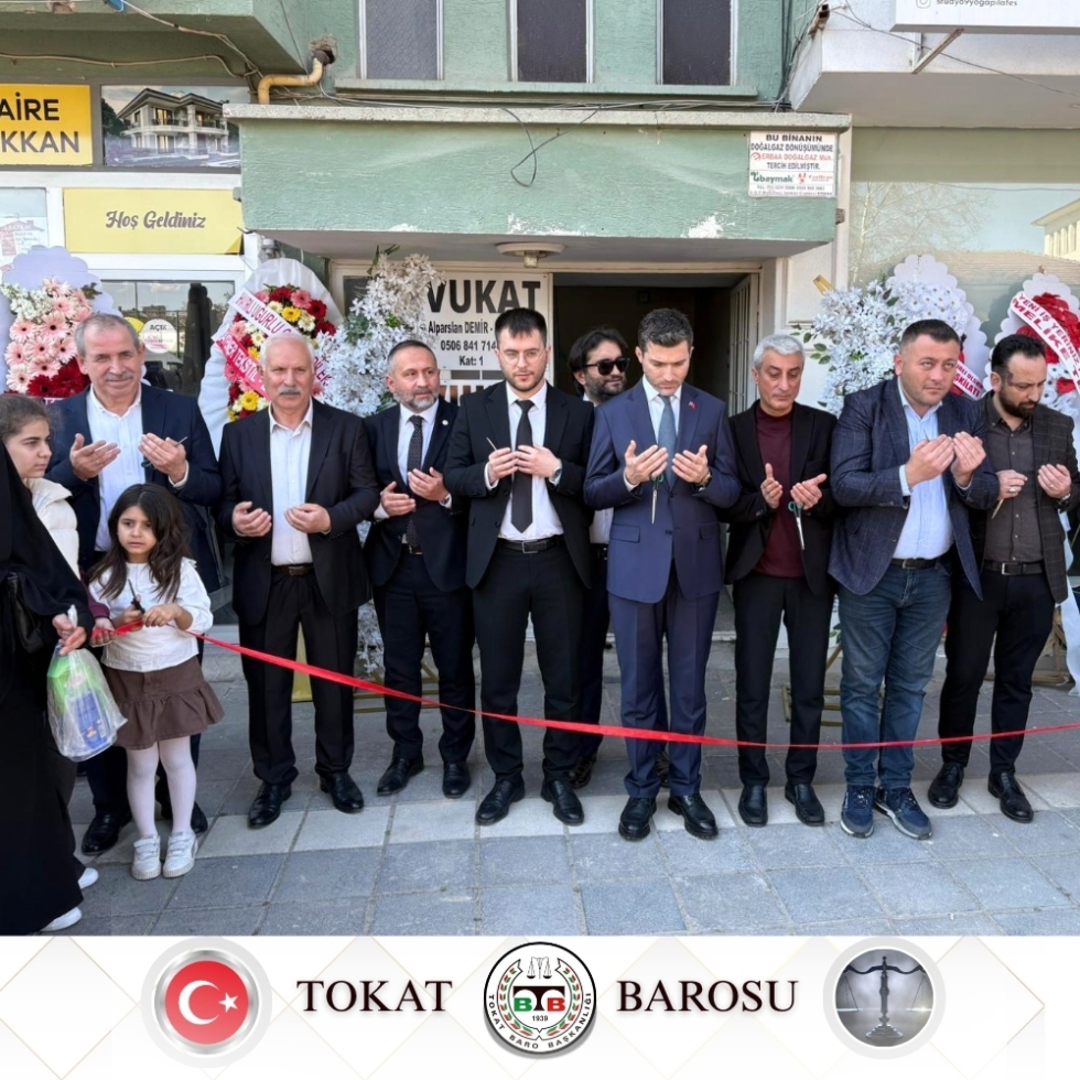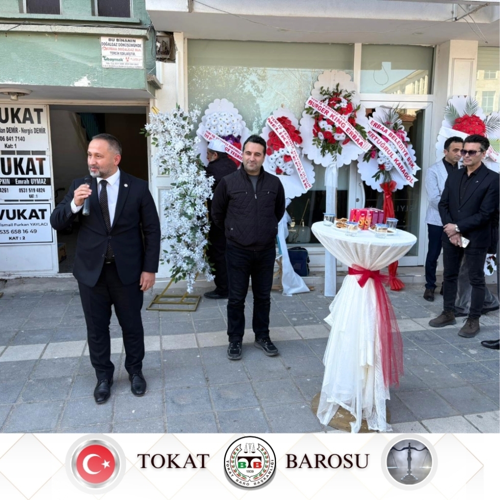 27.03.2026 tarihinde Erbaa Belediye Başkanı Ertuğrul KARAGÖL, Baro Başkanımız Av. Volkan BOZKURT, Erbaa Adli Müzaharet Temsilcimiz Av. Mustafa KÖK ve meslektaşlarımız, Av. İsmail Furkan YAYLACI' nın büro açılışına katıldılar.