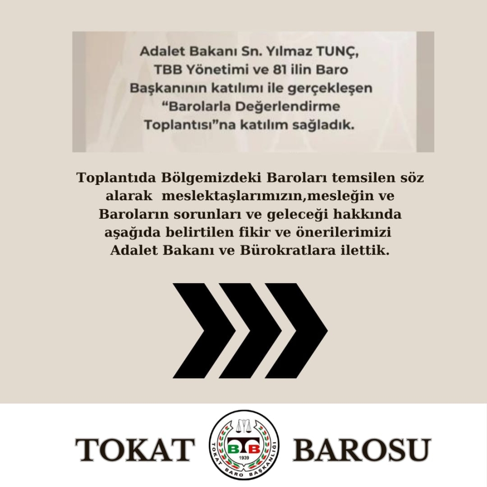 Türkiye Barolar Birliği (TBB) Başkanı Av. R. Erinç Sağkan, Yönetim Kurulu üyeleri ve tüm Baro Başkanlarından oluşan heyet, Adalet Bakanı Yılmaz Tunç’la, avukatlık mesleğinin sorunları ve bu sorunların çözümüne yönelik bir değerlendirme toplantısı yaptı.