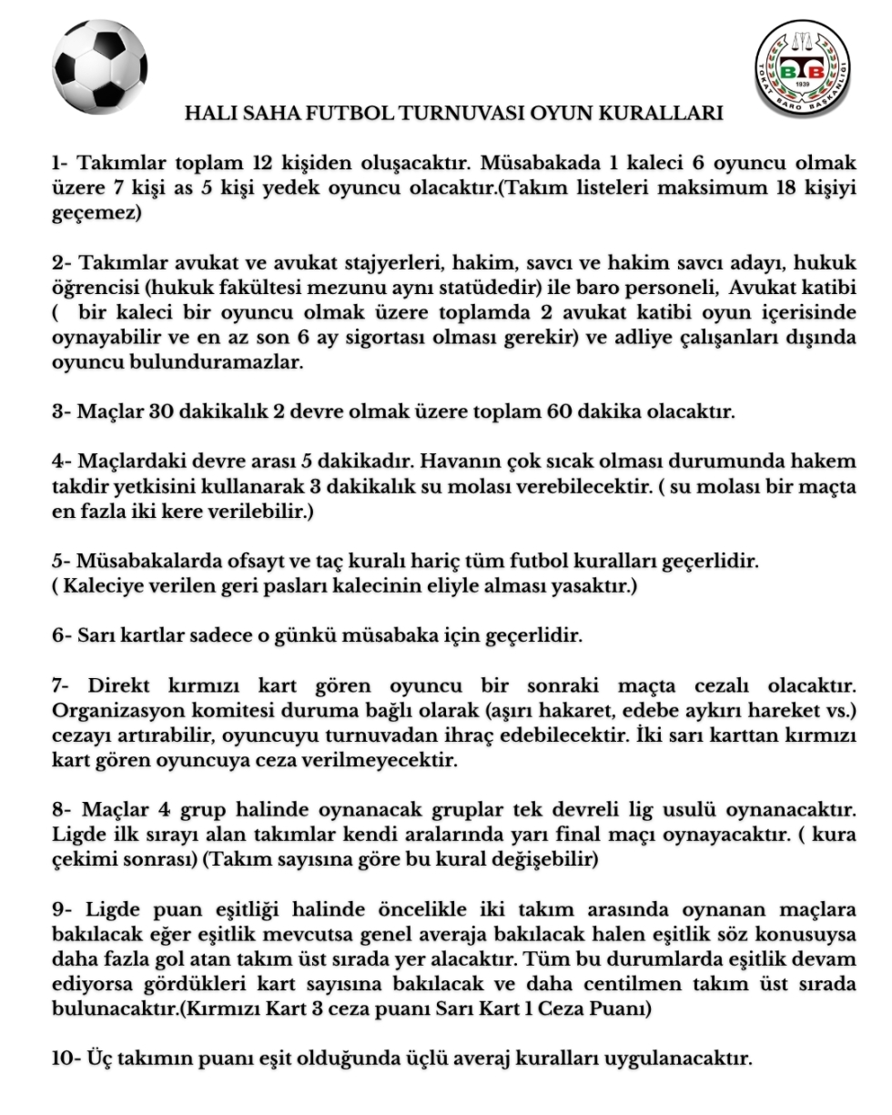 Tokat Barosu Geleneksel Halı Saha Turnuvası ve Oyun Kuralları 2026